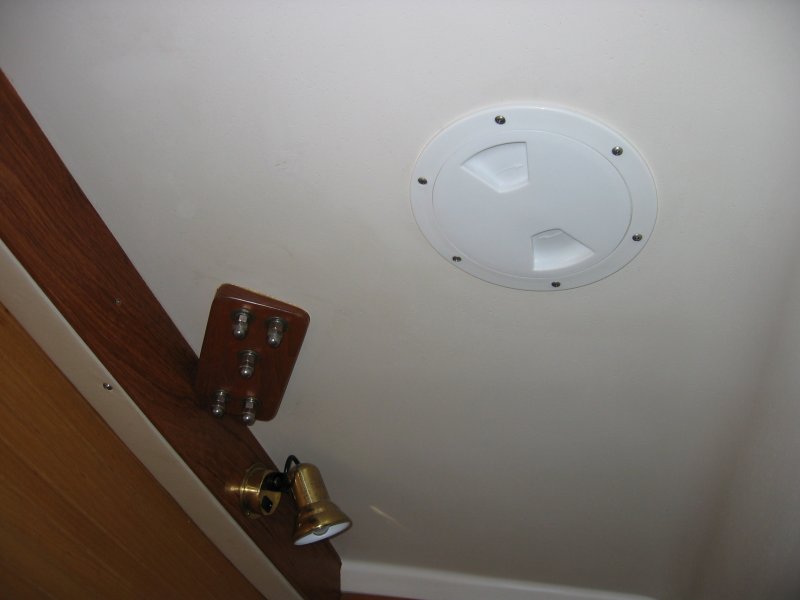 Underside of starboard turning block and winch. Teak block is cut at same angle as block on deck. Hand-hole is 6" diameter.